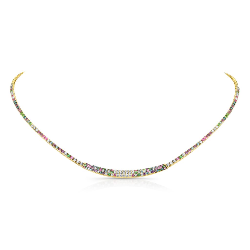 This High Jewelry collection is a celebration of light and color in motion. Lumière unveils a perfect gradient of brilliance, where pavé diamonds and gemstones blend seamlessly, creating a mesmerizing ombré effect that radiates depth and luminosity. The interplay of colors, meticulously arranged in a harmonious transition, enhances the vibrancy of each central gem. A fusion of artistry, radiance, and elegance, Lumière captures the essence of movement, transforming light into pure sophistication.