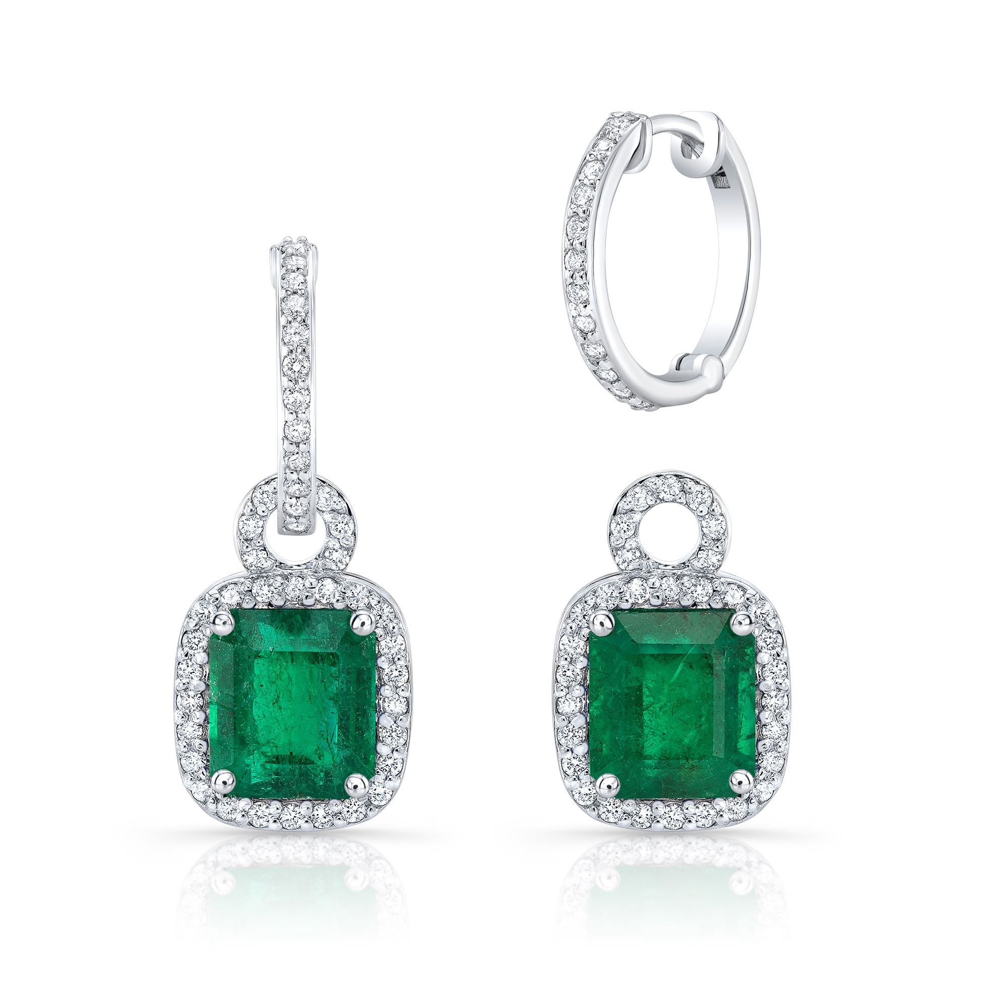 Dangling emerald-cut emerald earrings with cushion halo and removable huggie