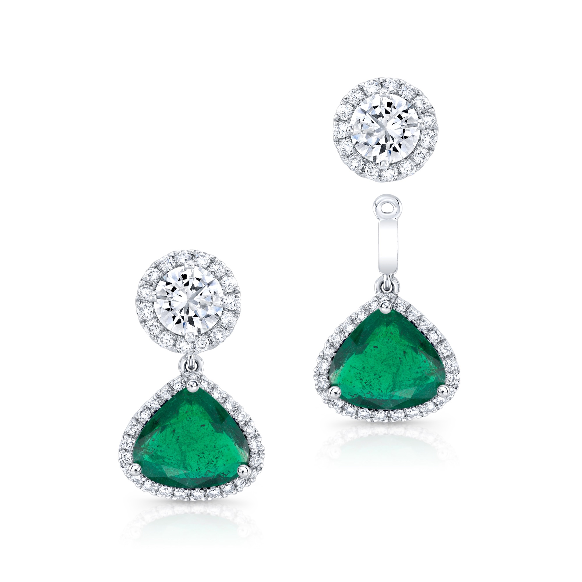 Diamond studs with halo and removable elongated pear-shape emeralds with diamond halo