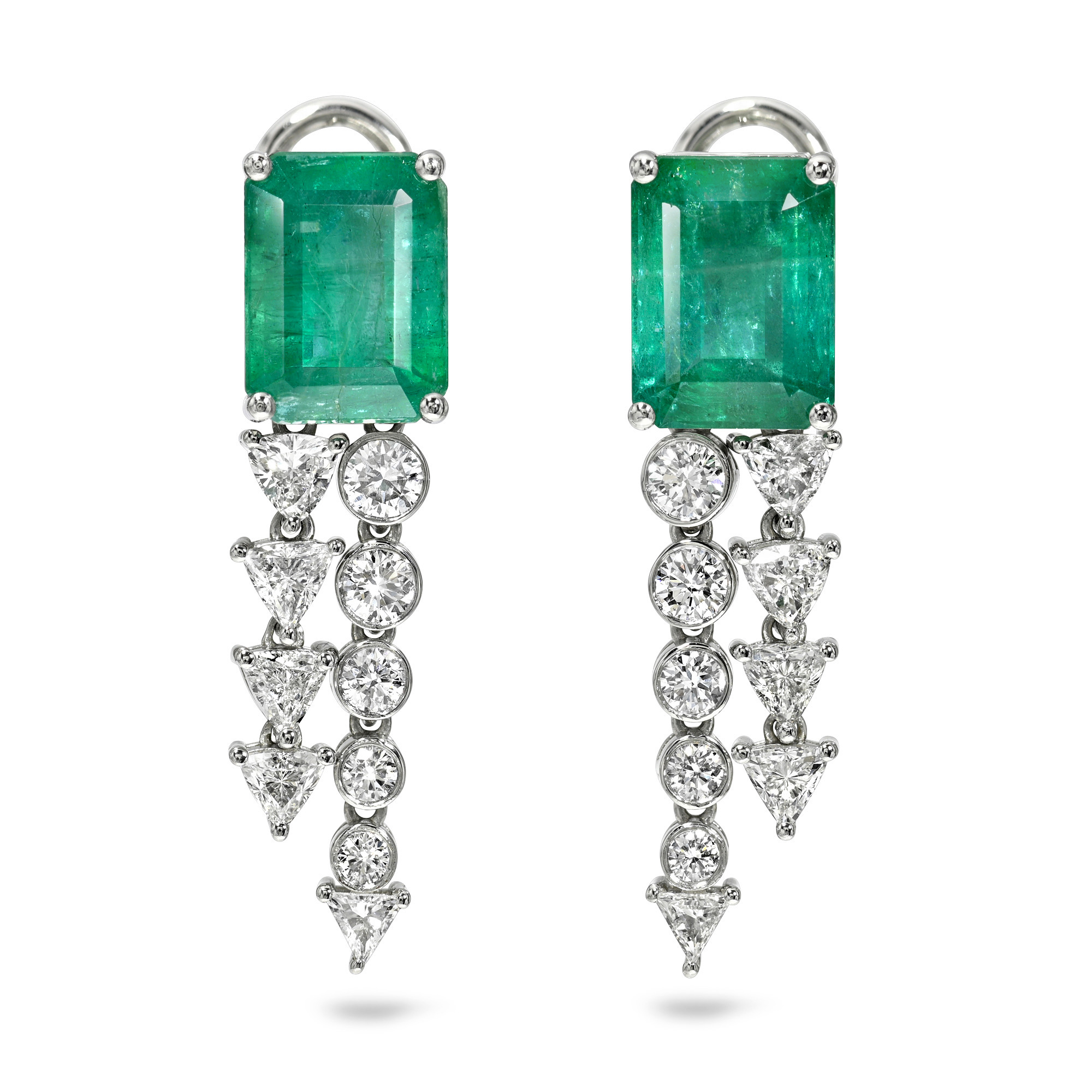 Emerald earrings with a dangling row of trillion cut diamonds and graduated briliant cut diamonds