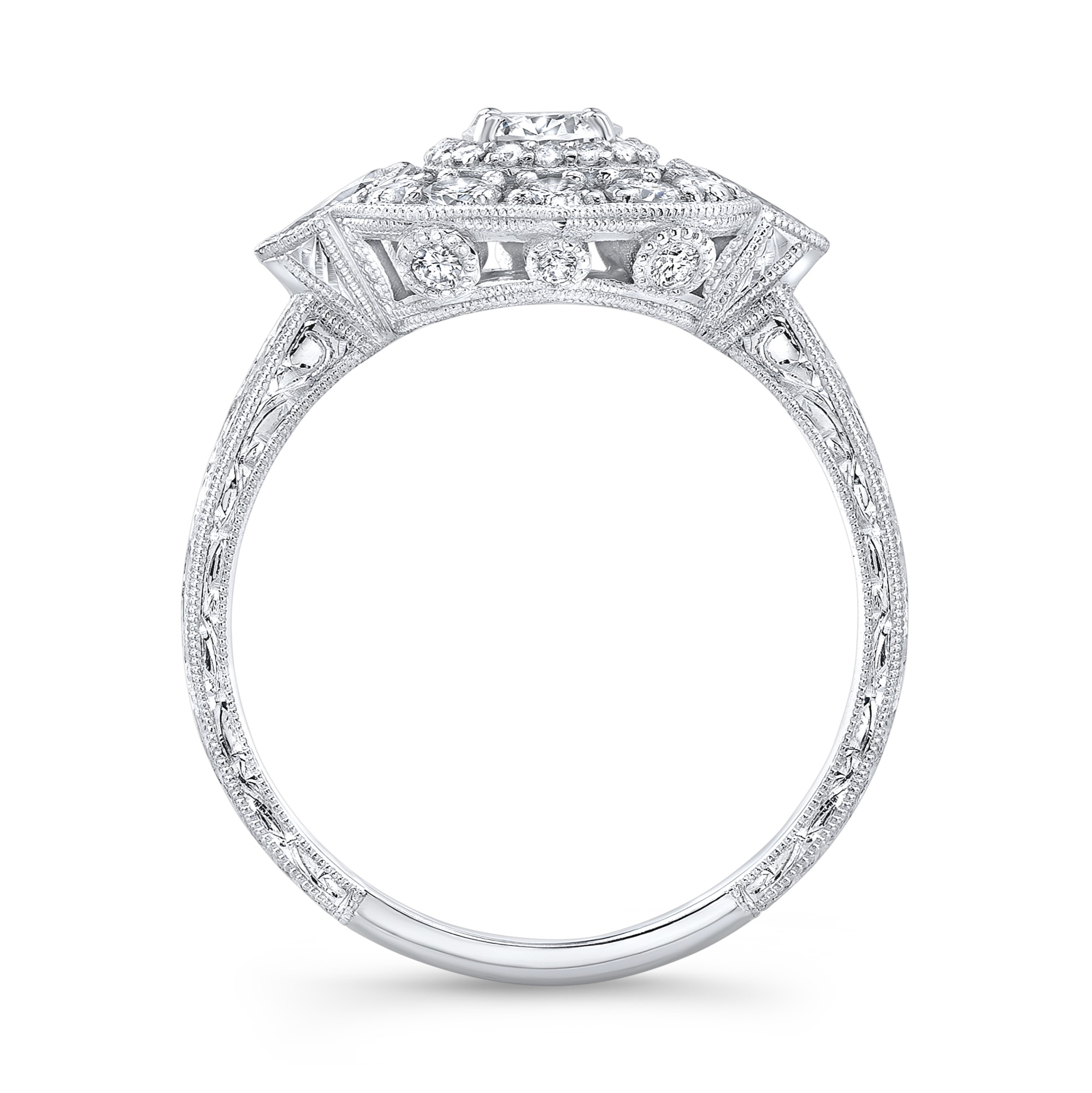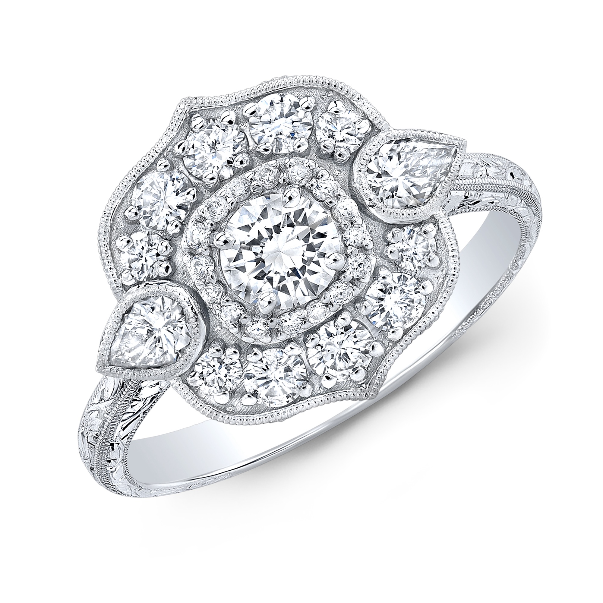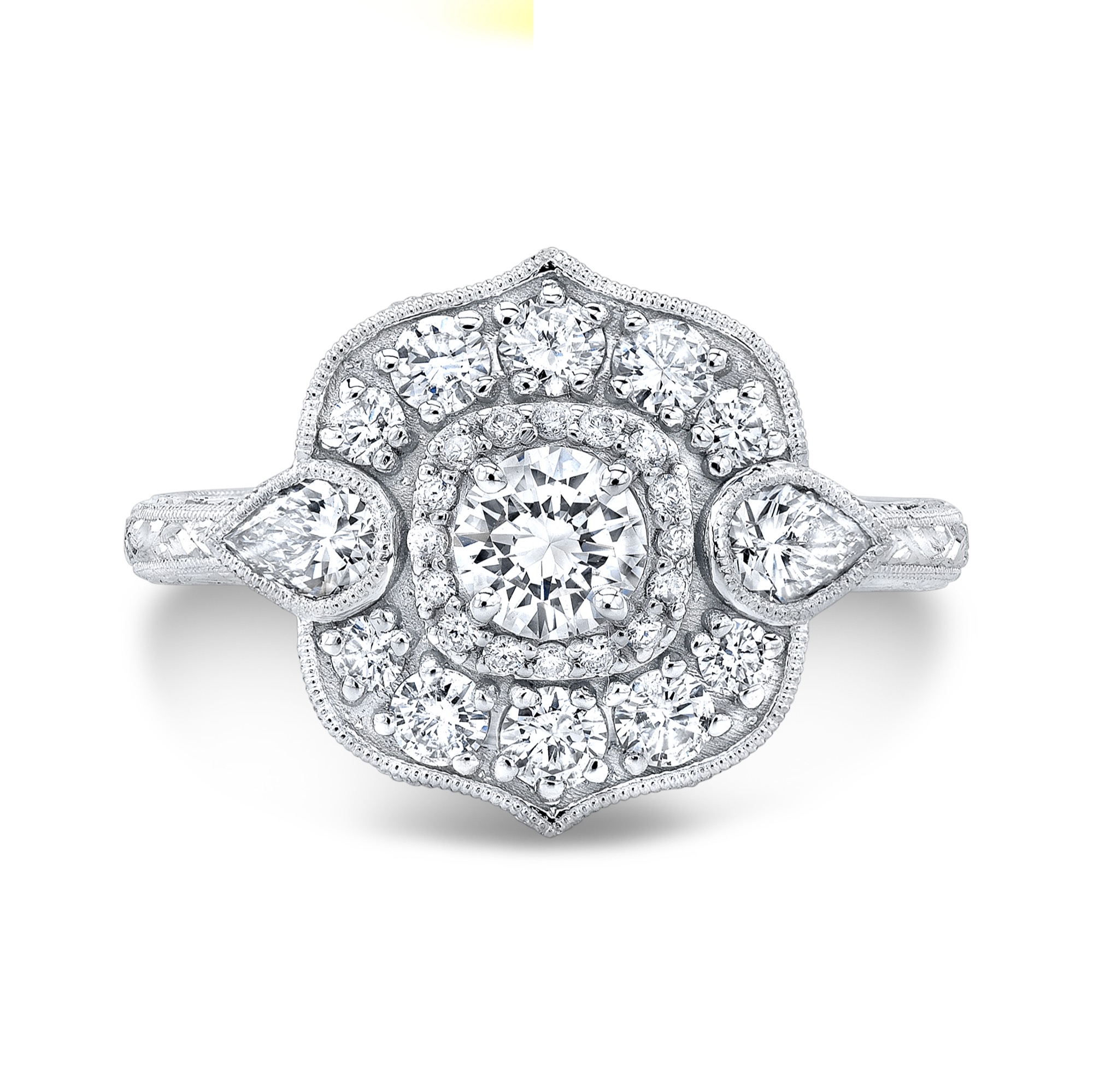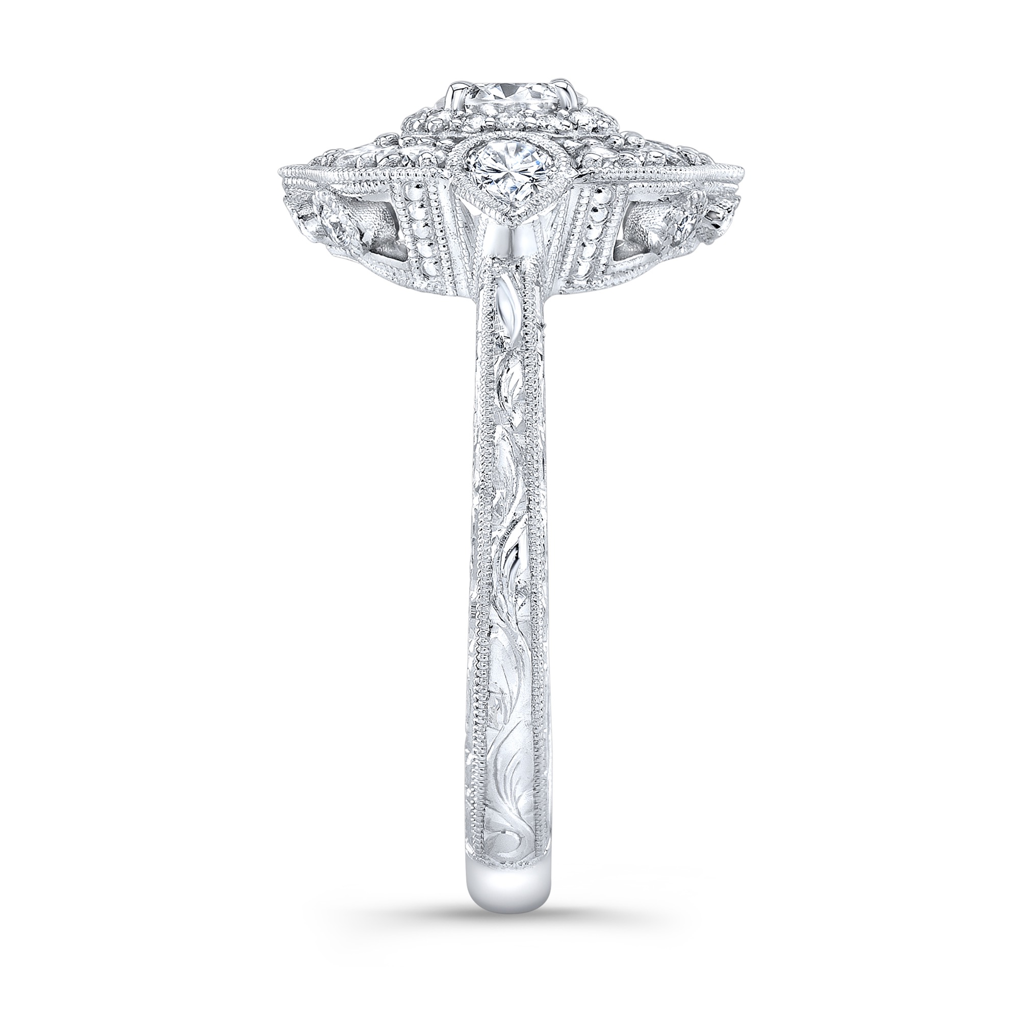 Four-prong basket setting with doublue halo, accent diamonds and engraved shank