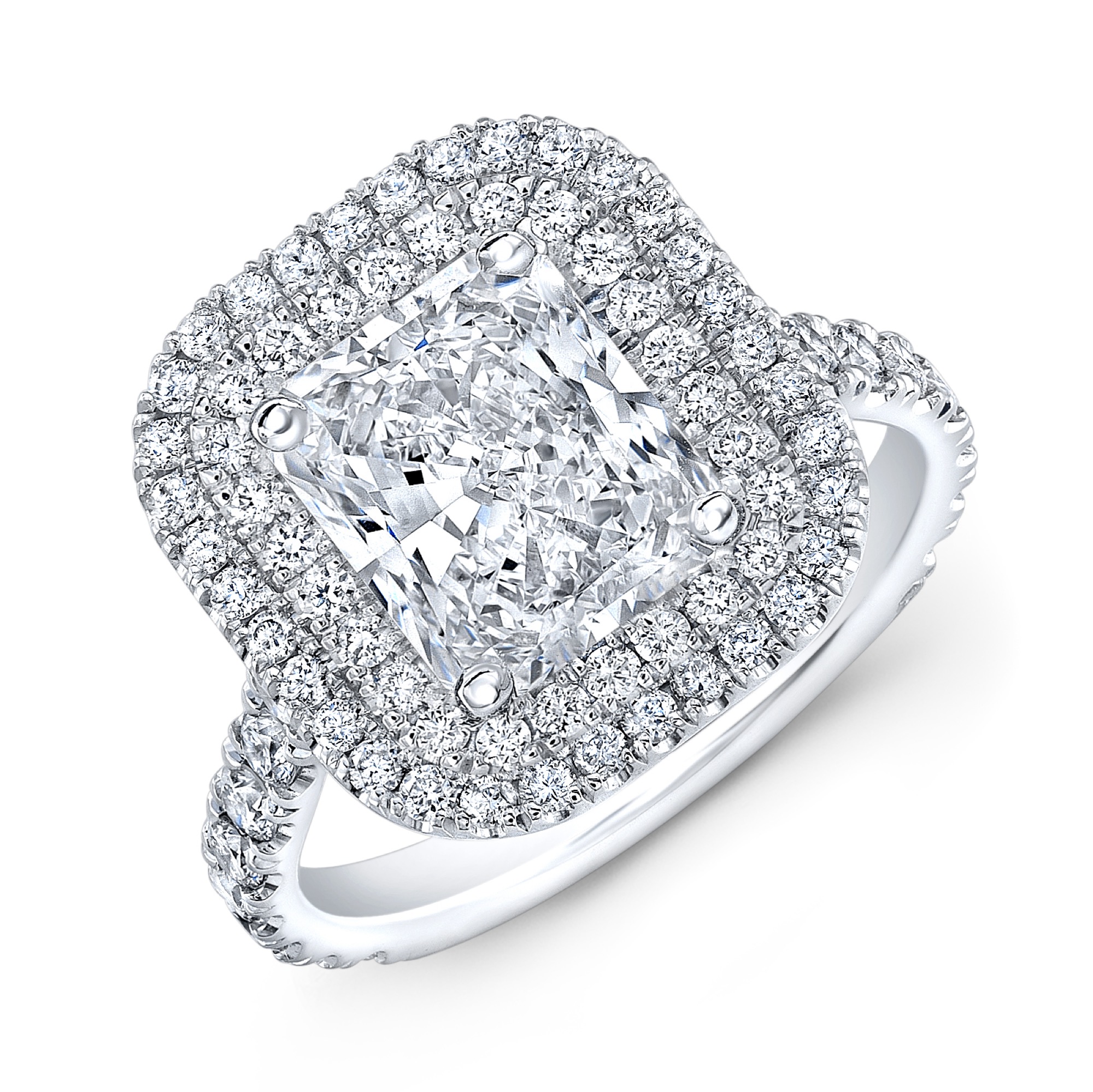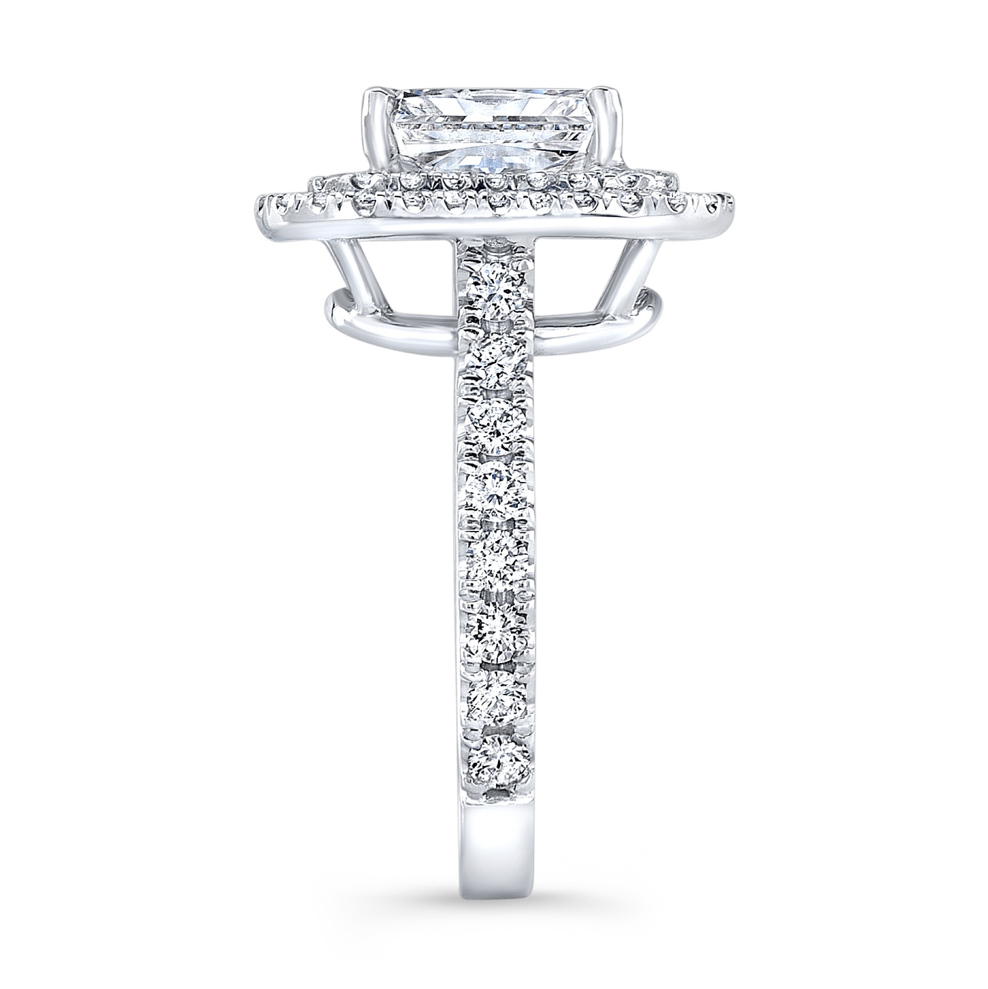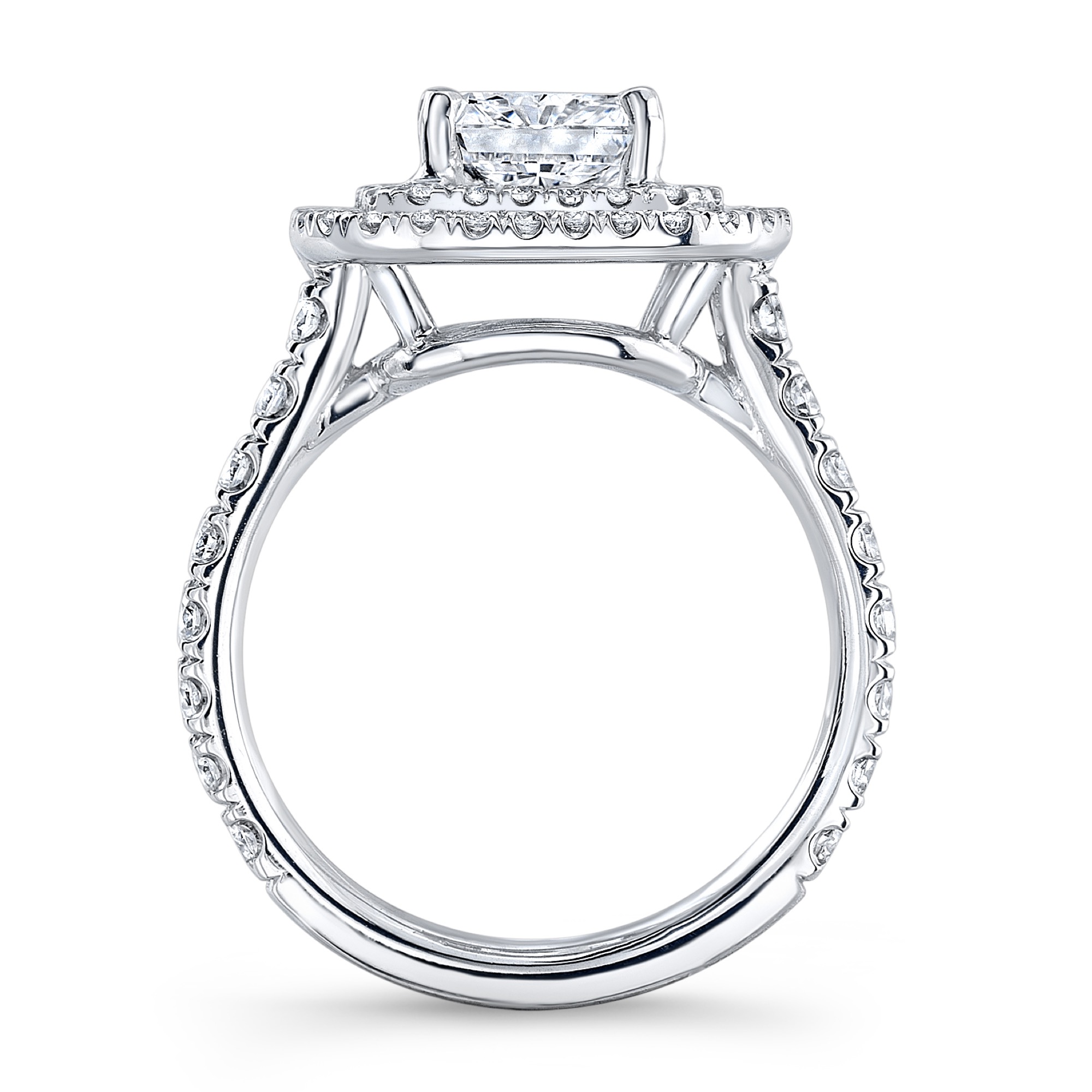 Four-prong raised floating double halo setting with a u-set diamond shank