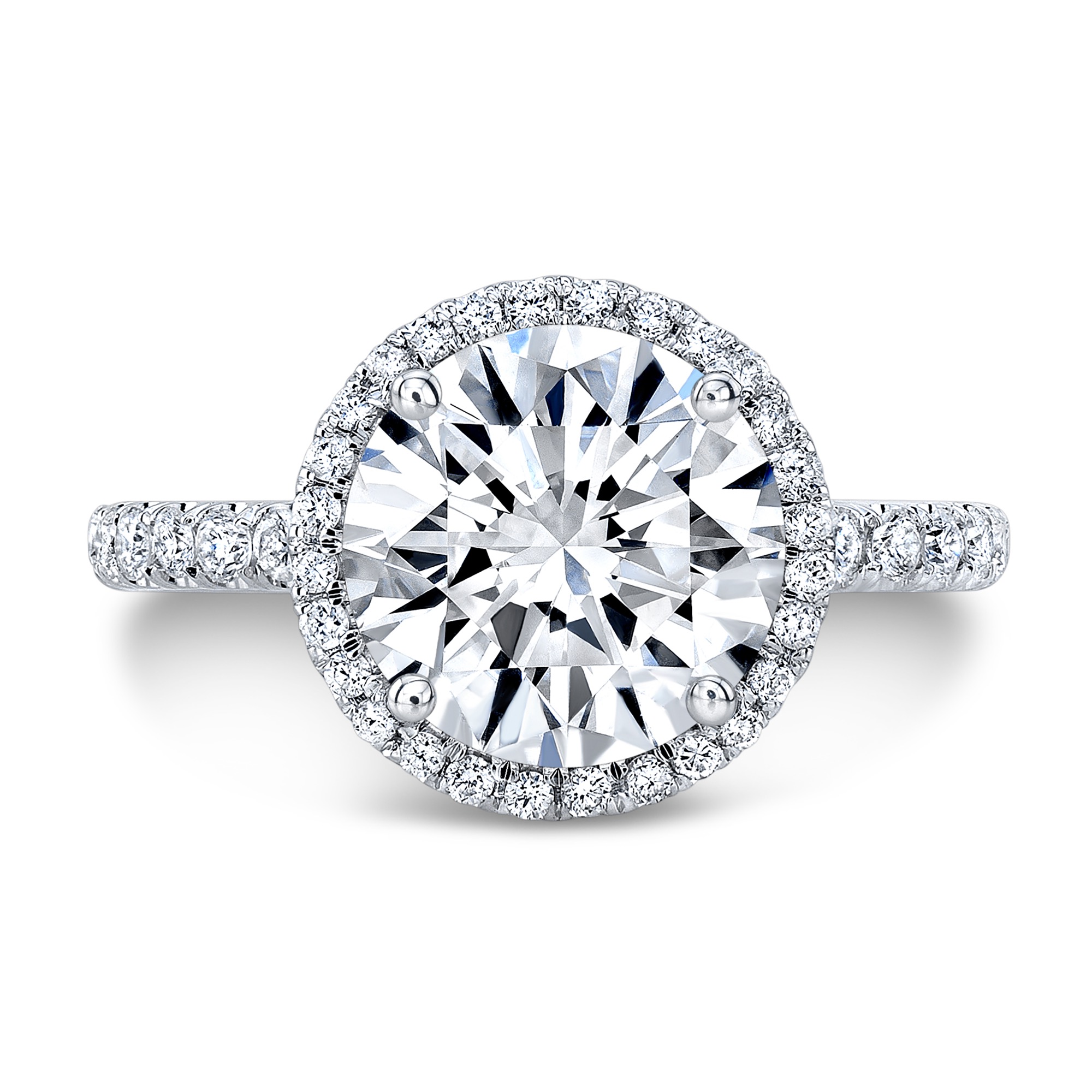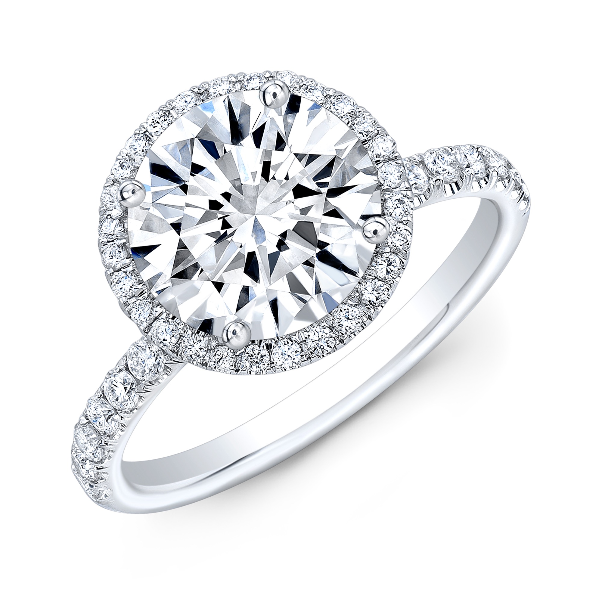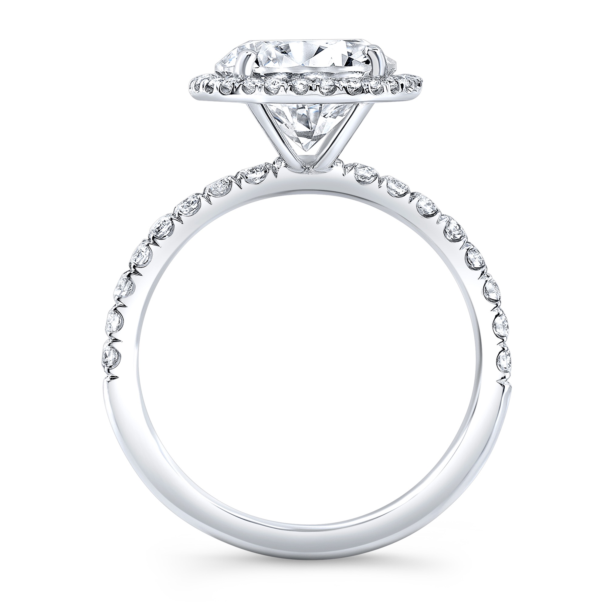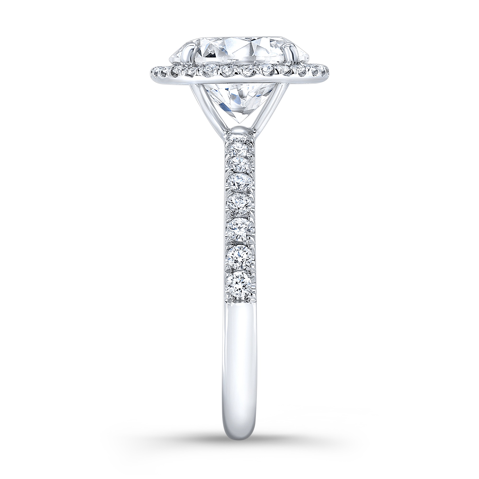 Four-prong wire basket setting with a diamond halo and u-set diamonds along the shank