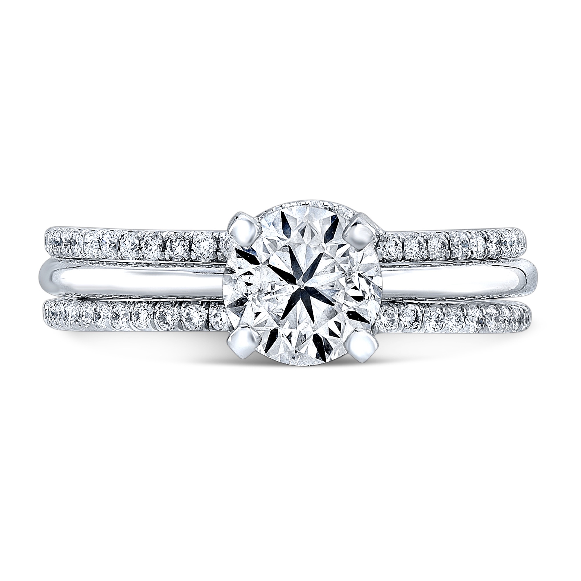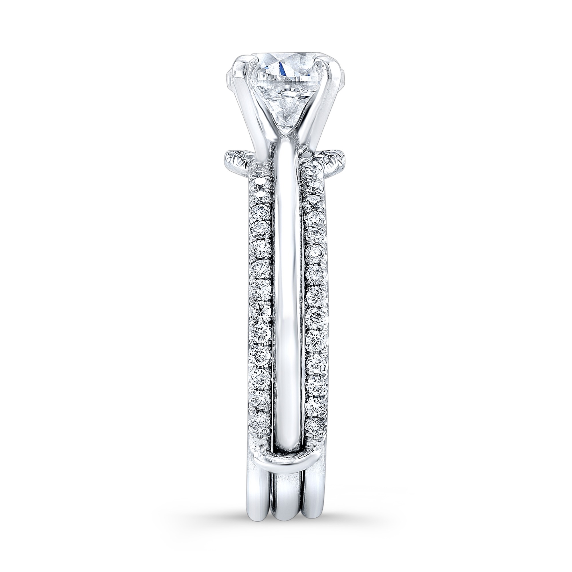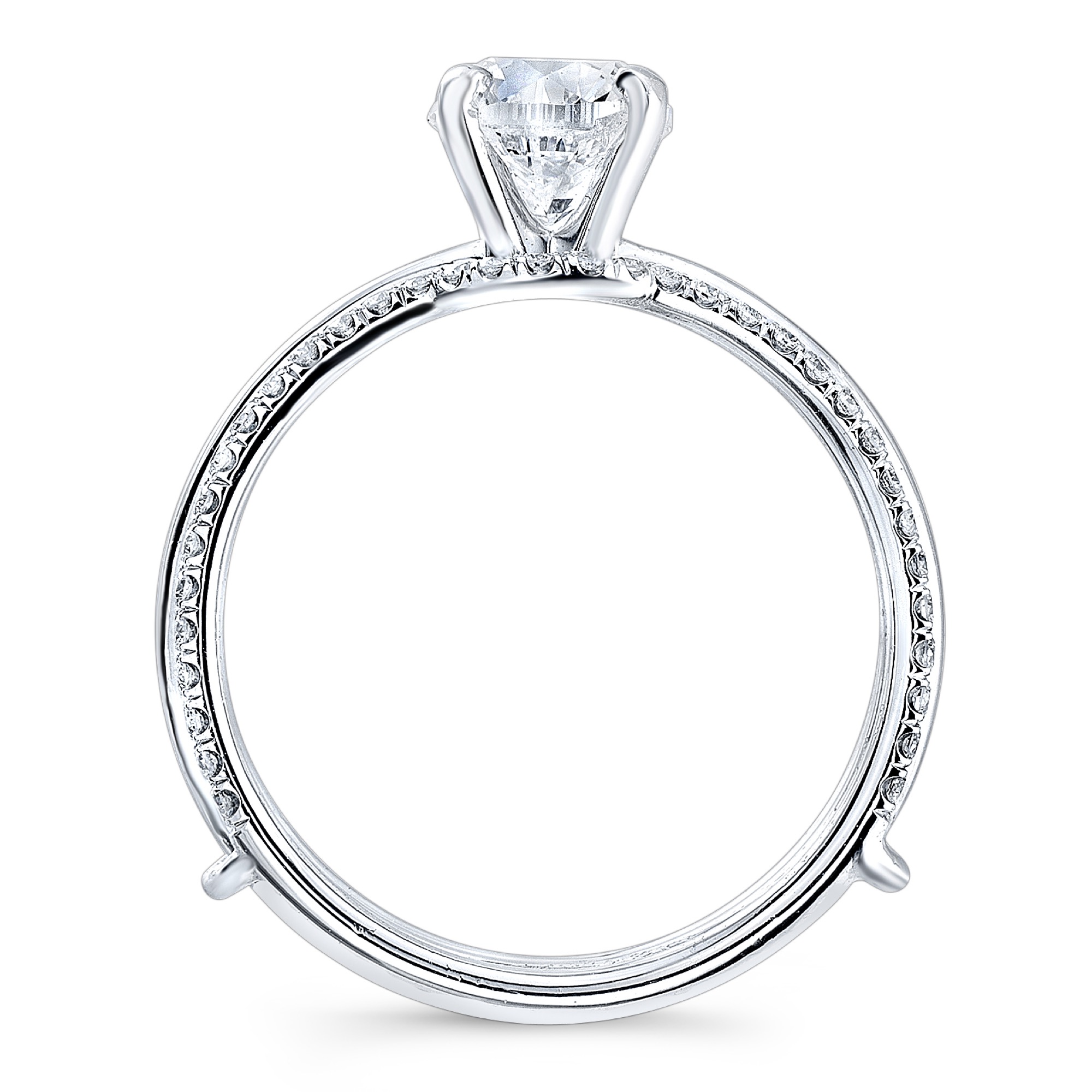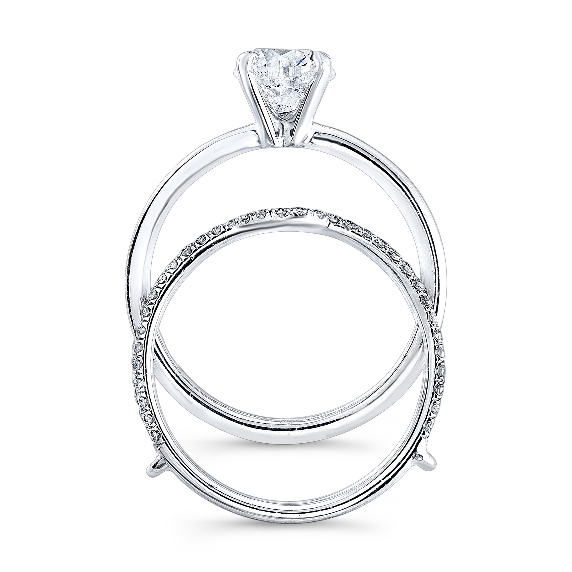 Integrated four prong cathedral basket with thin half round shank and removable ring guard