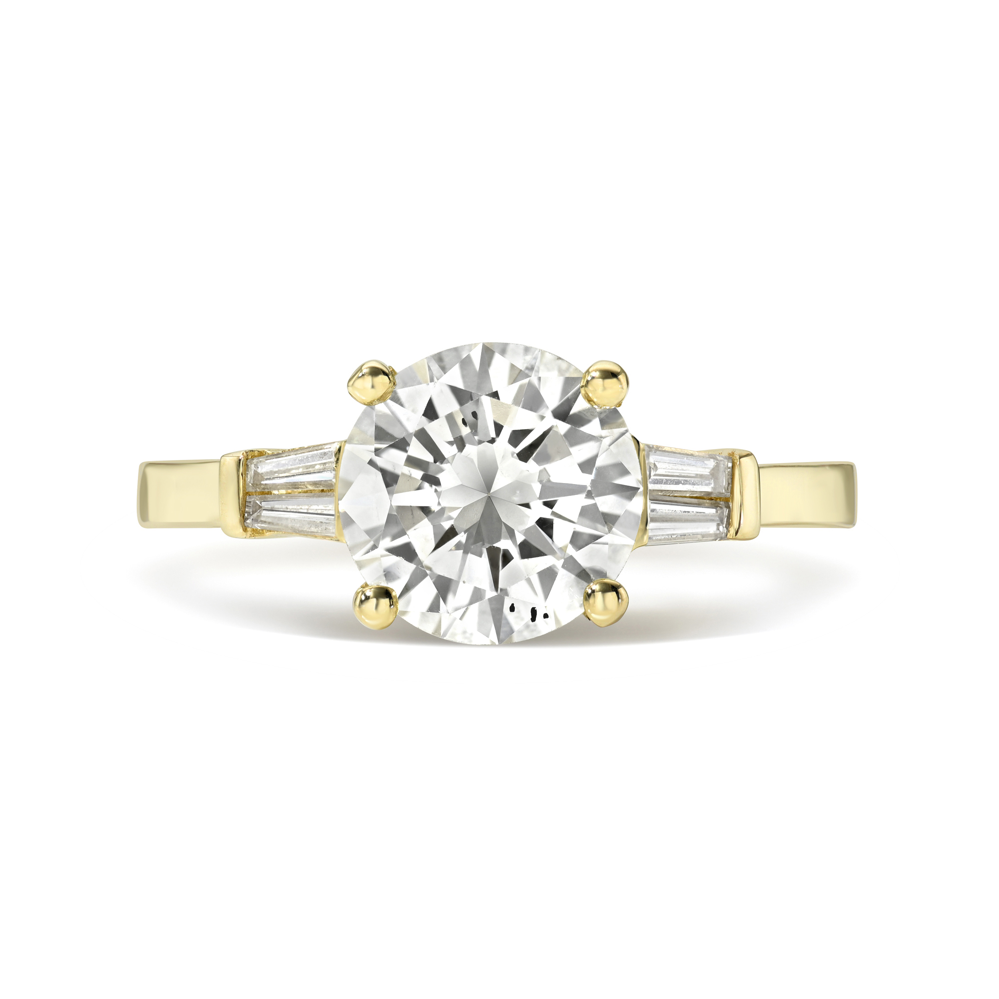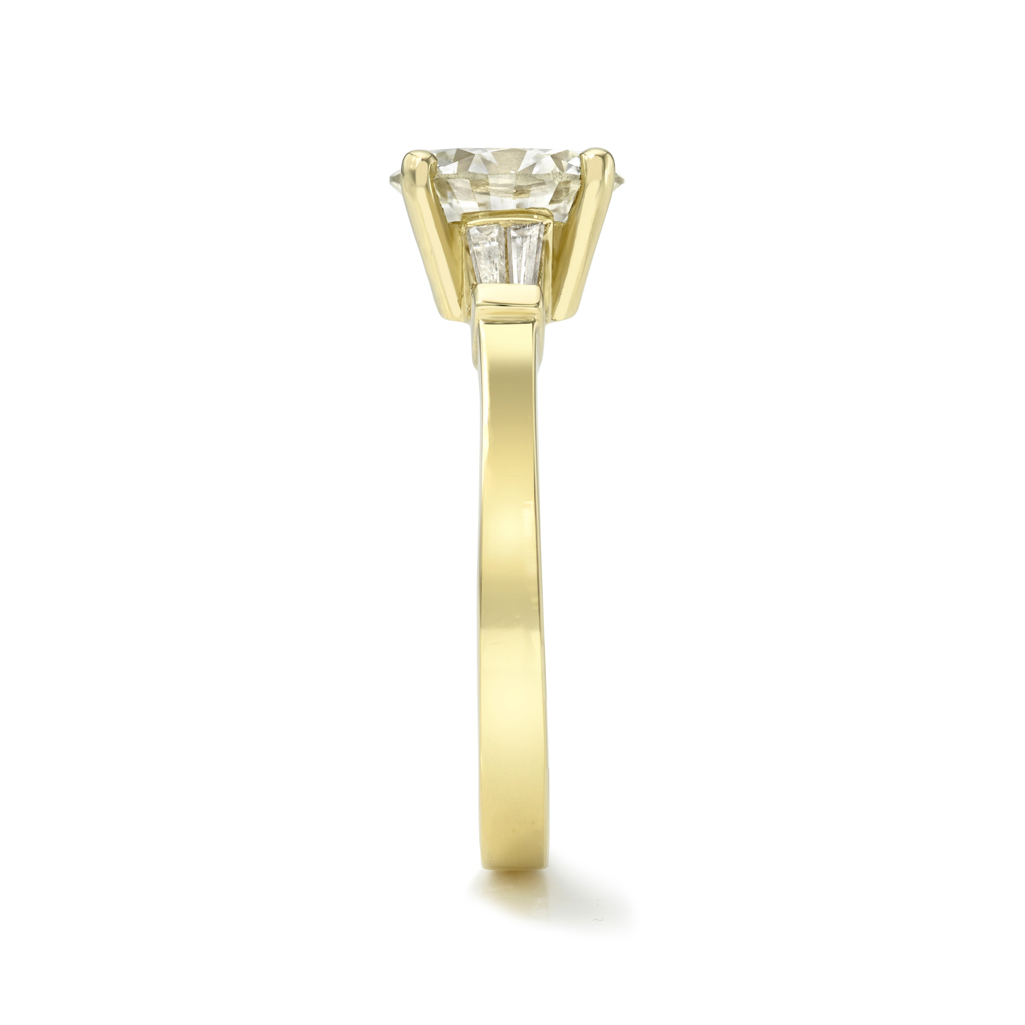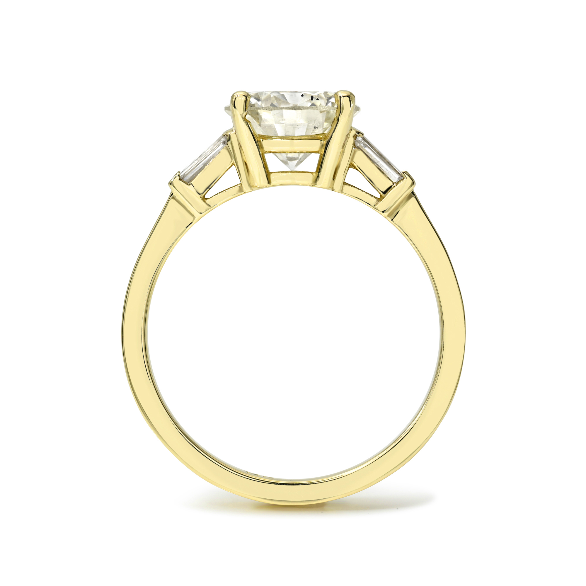 Low four-prong basket setting with double tapered baguette side stones