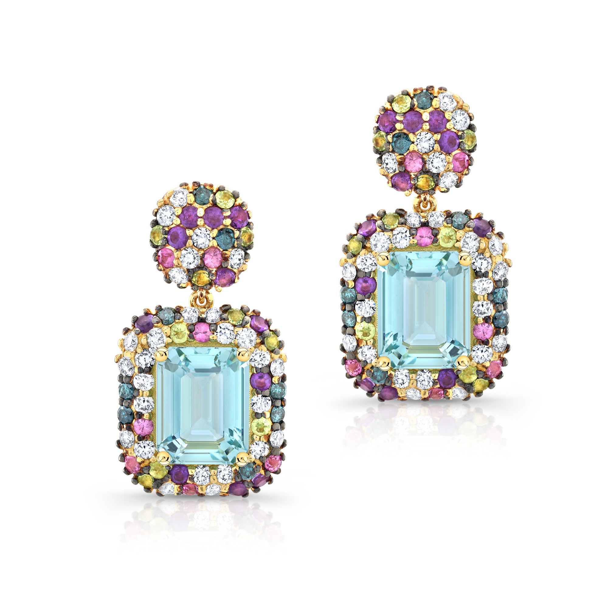 Mixed color saphire and diamond pave earring and emerald cut aquamarine
