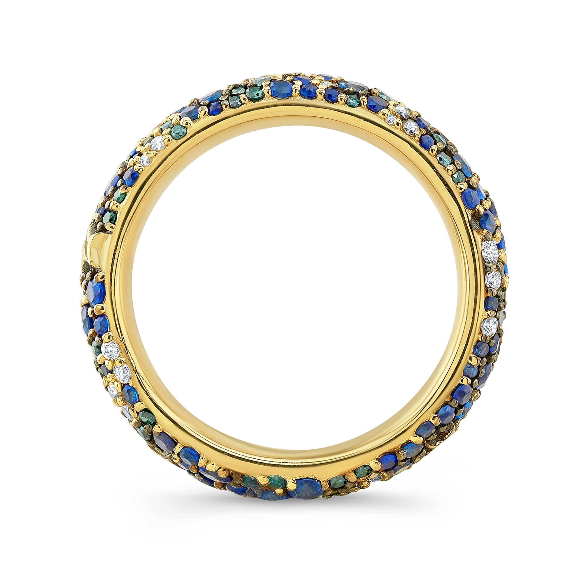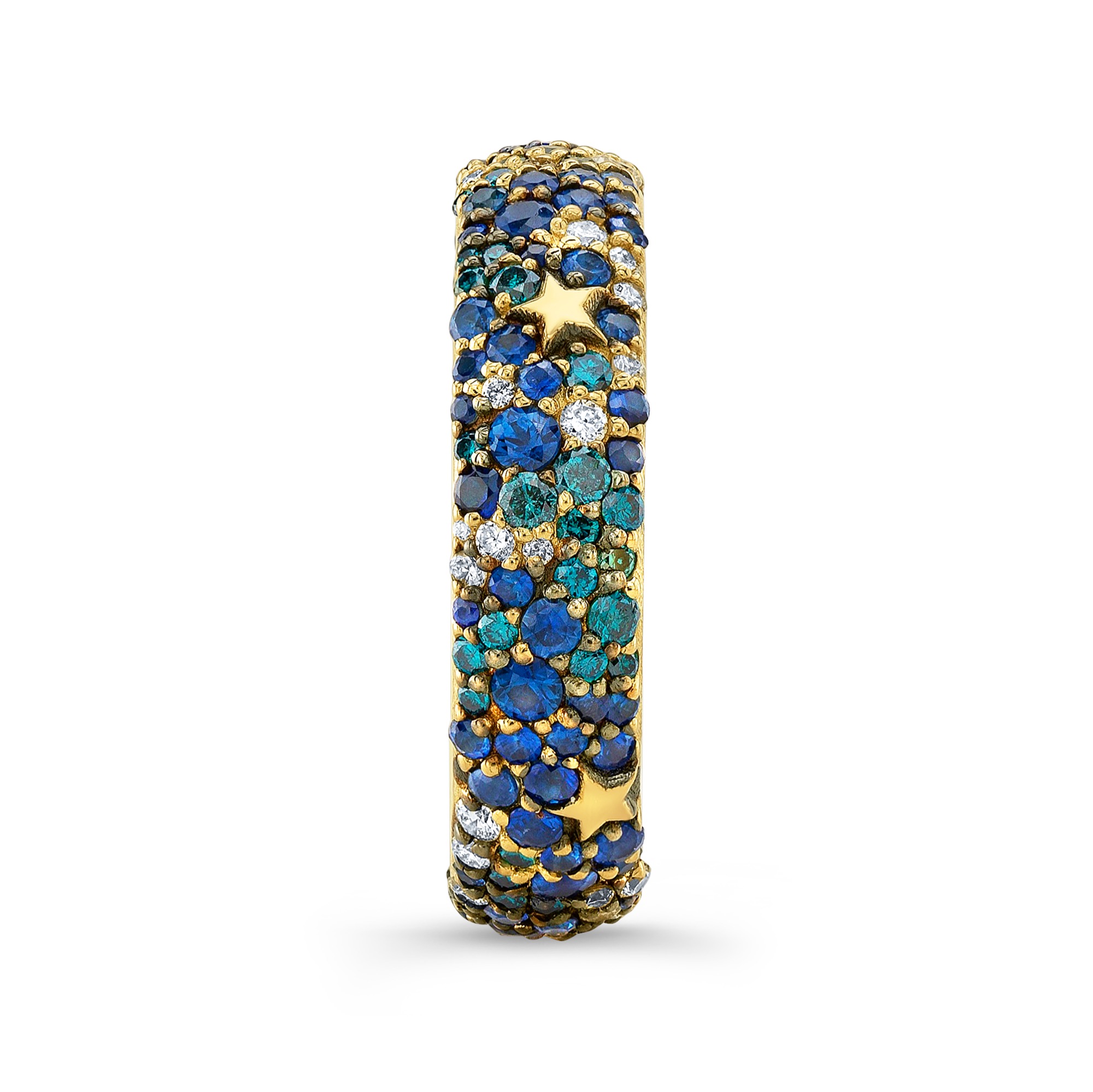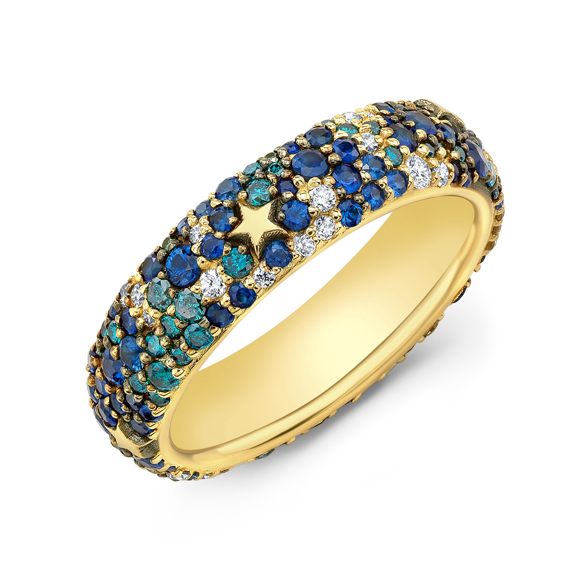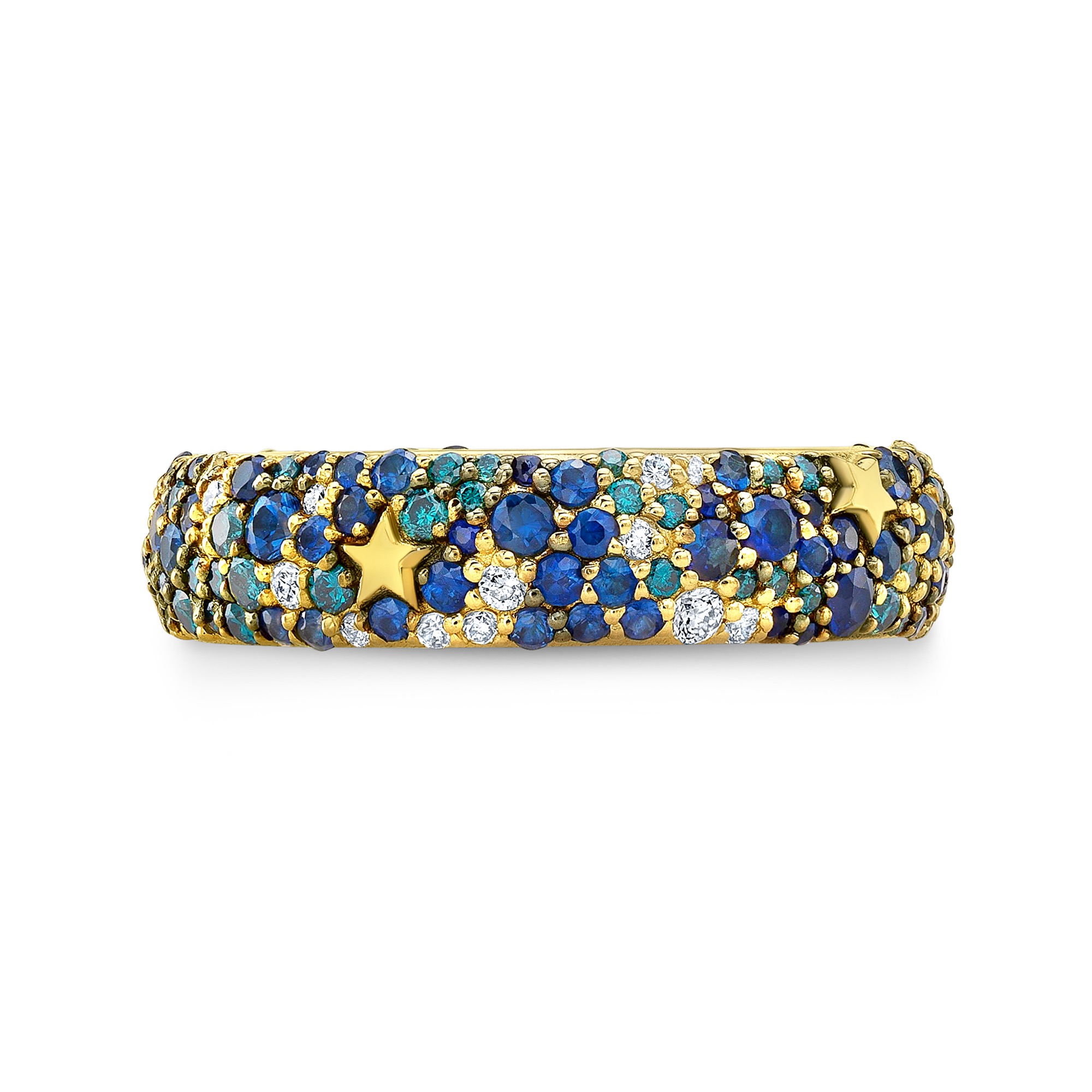 Mixed diamond and sapphires snow pave ring with incrusted gold stars