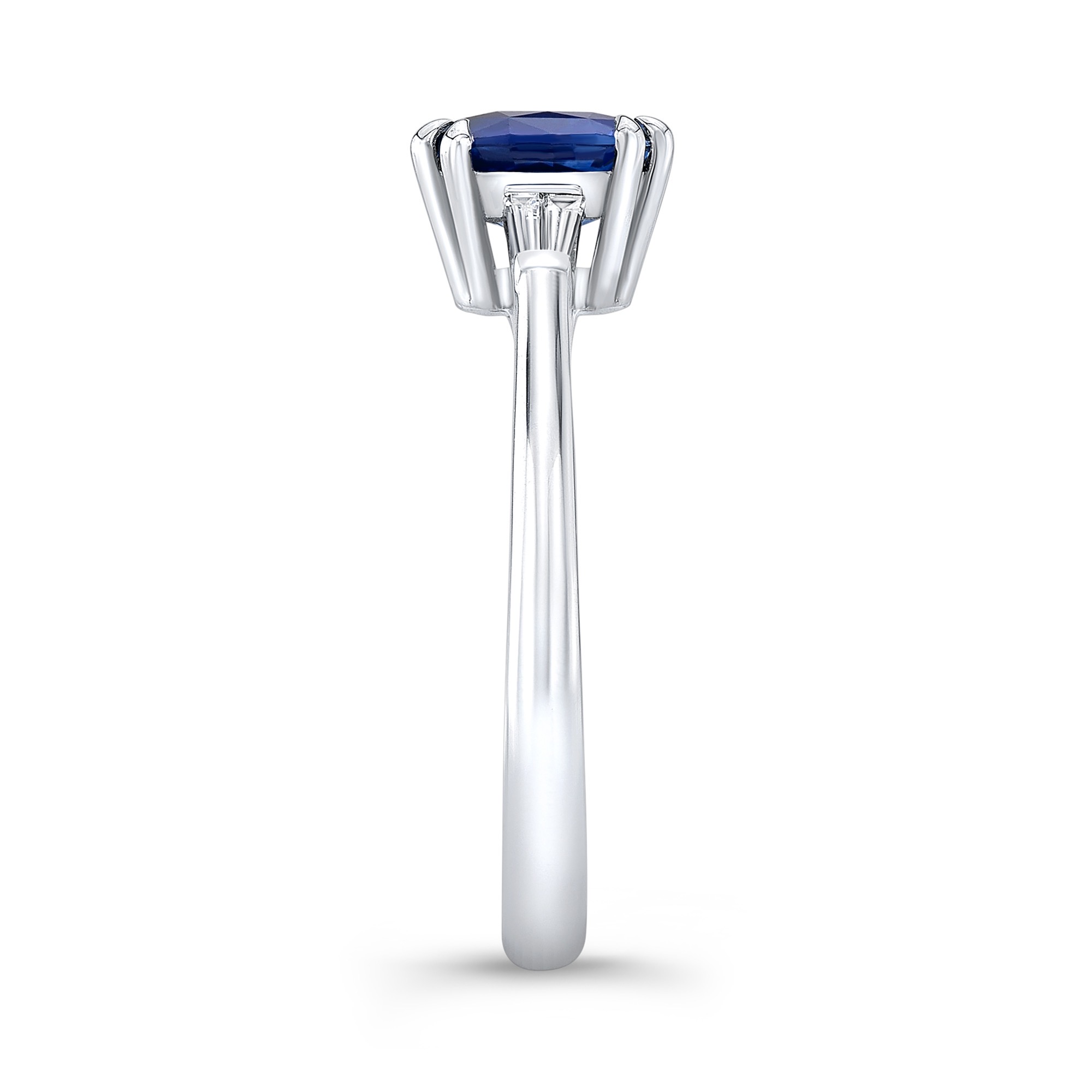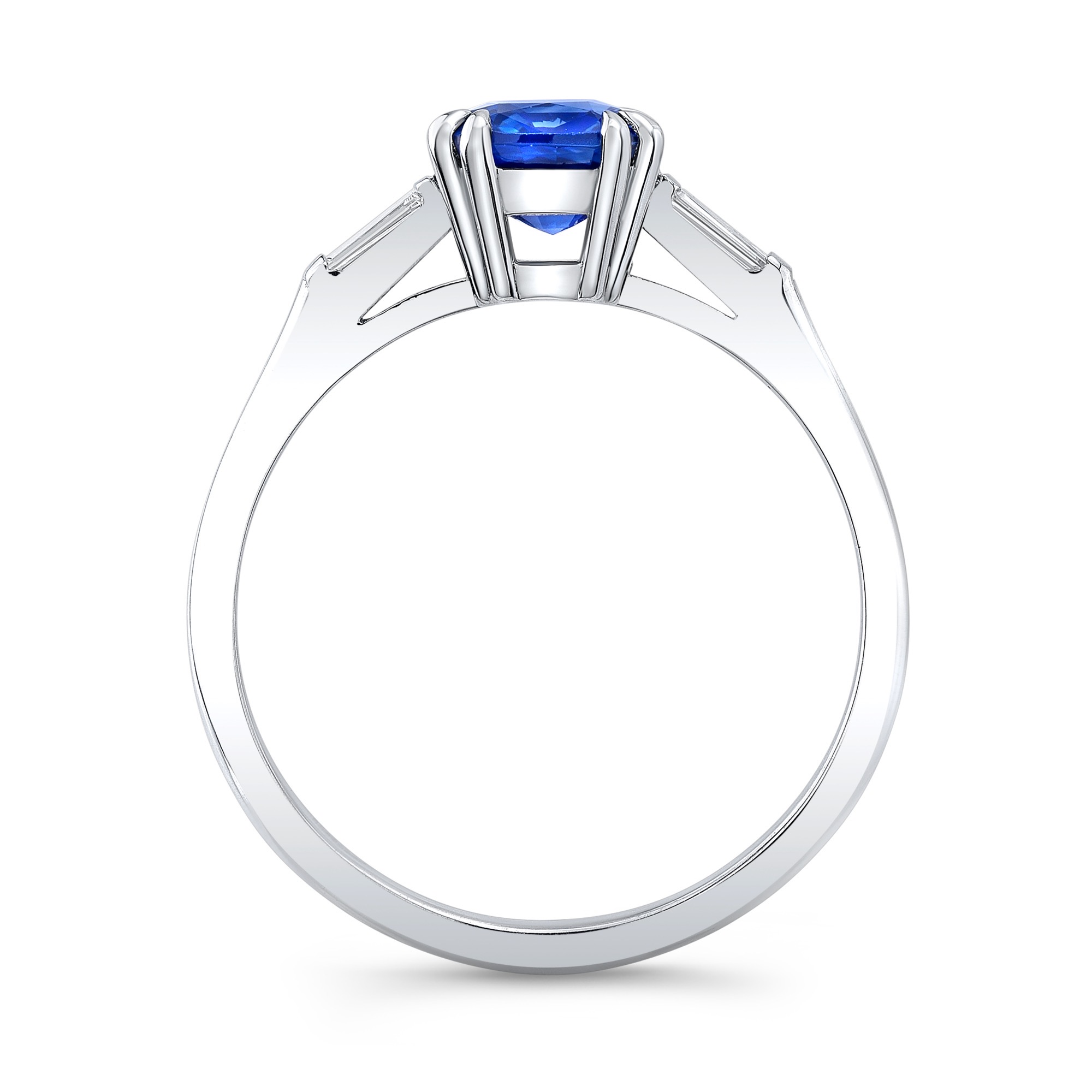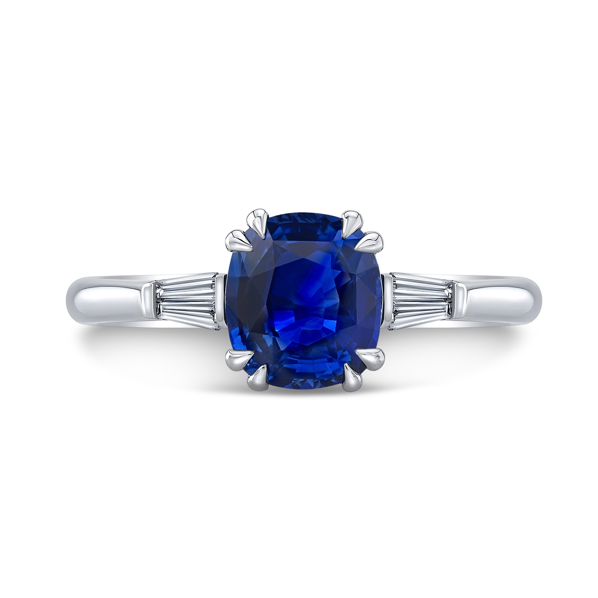 Cushion blue sapphire ring with tapered baguettes