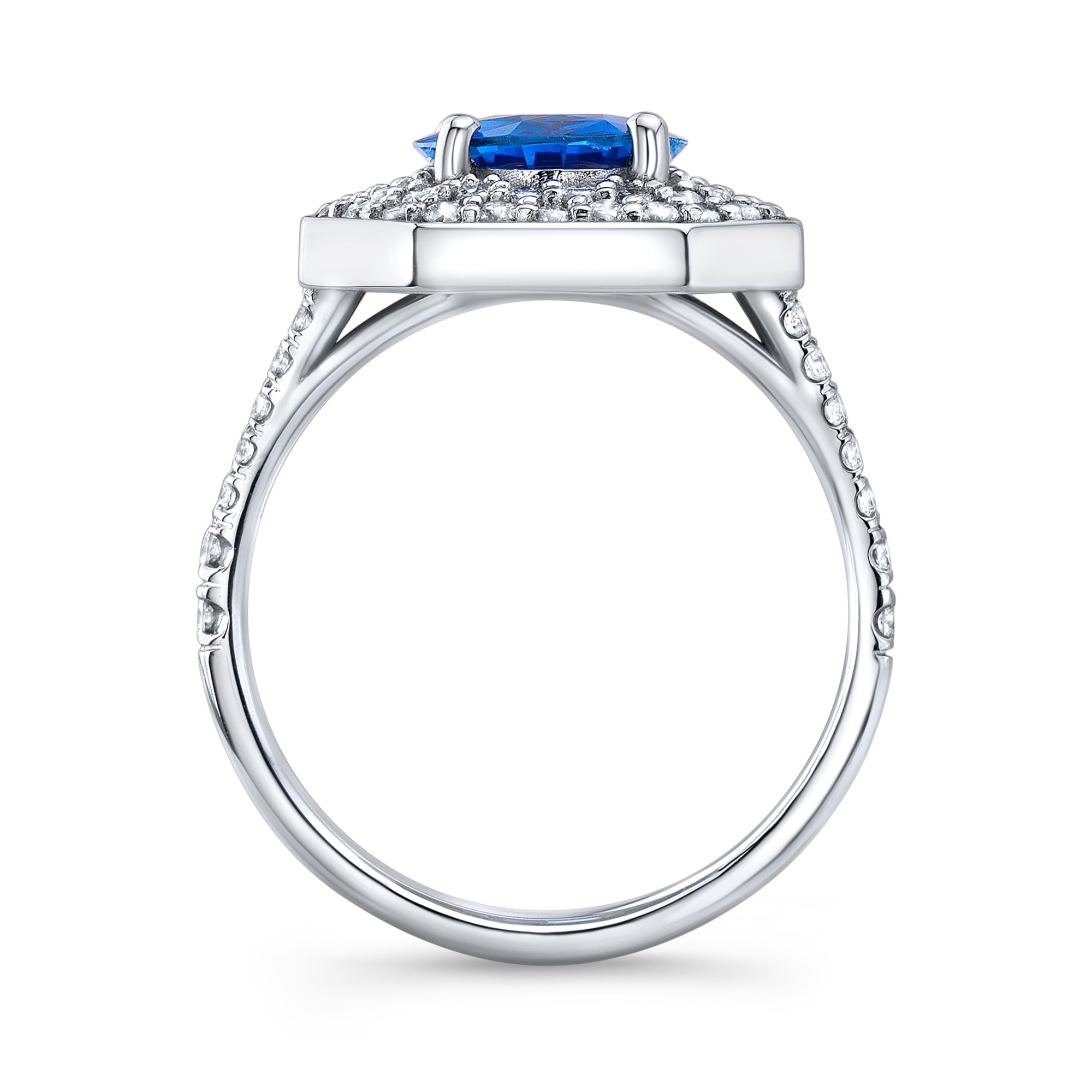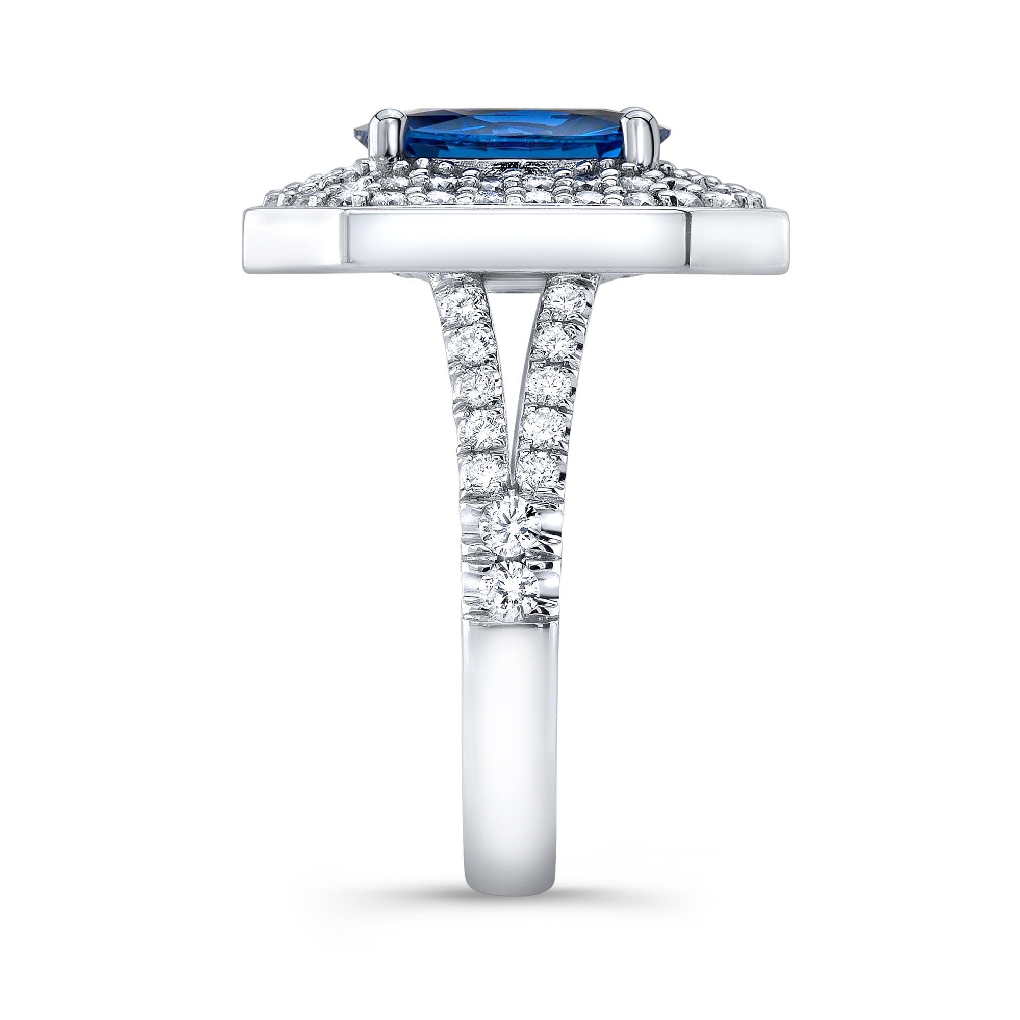 Oval sapphire with double diamond halo with emerald cut framing