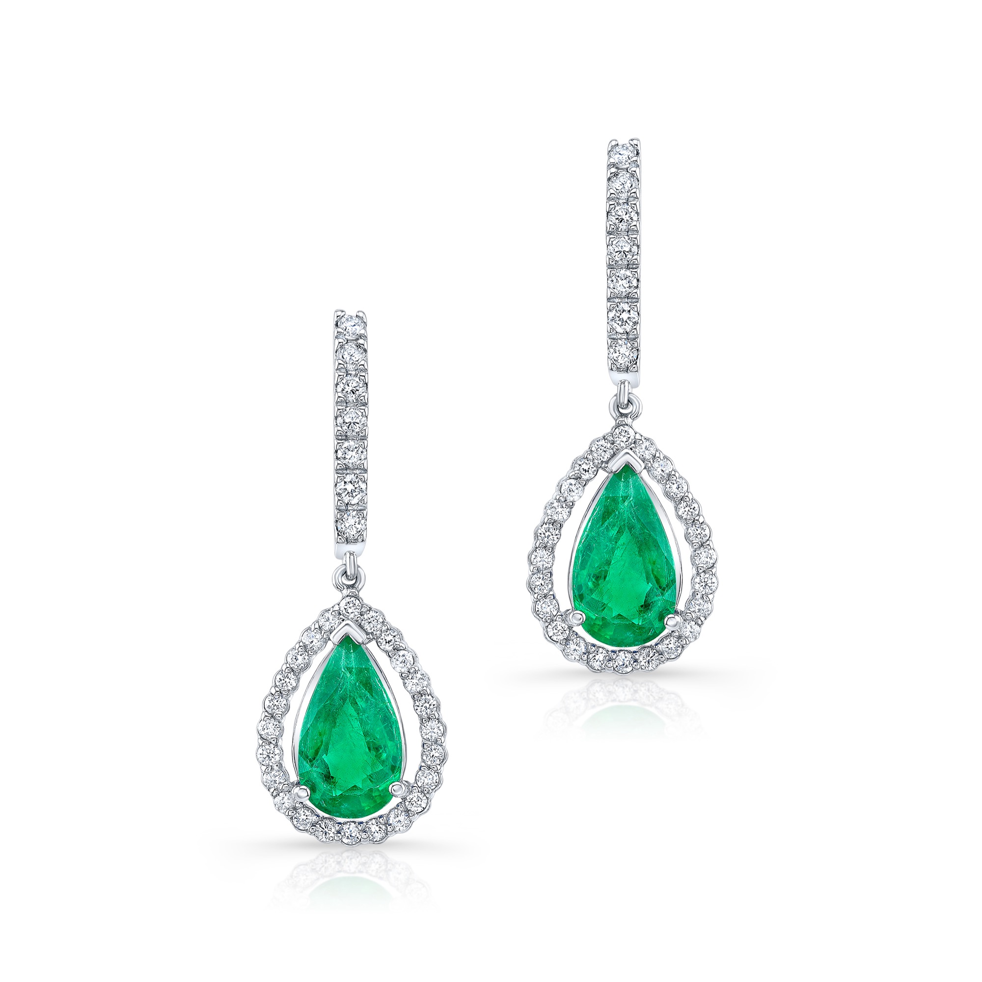 Pear-shaped emerald dangling earrings with floating diamond halo