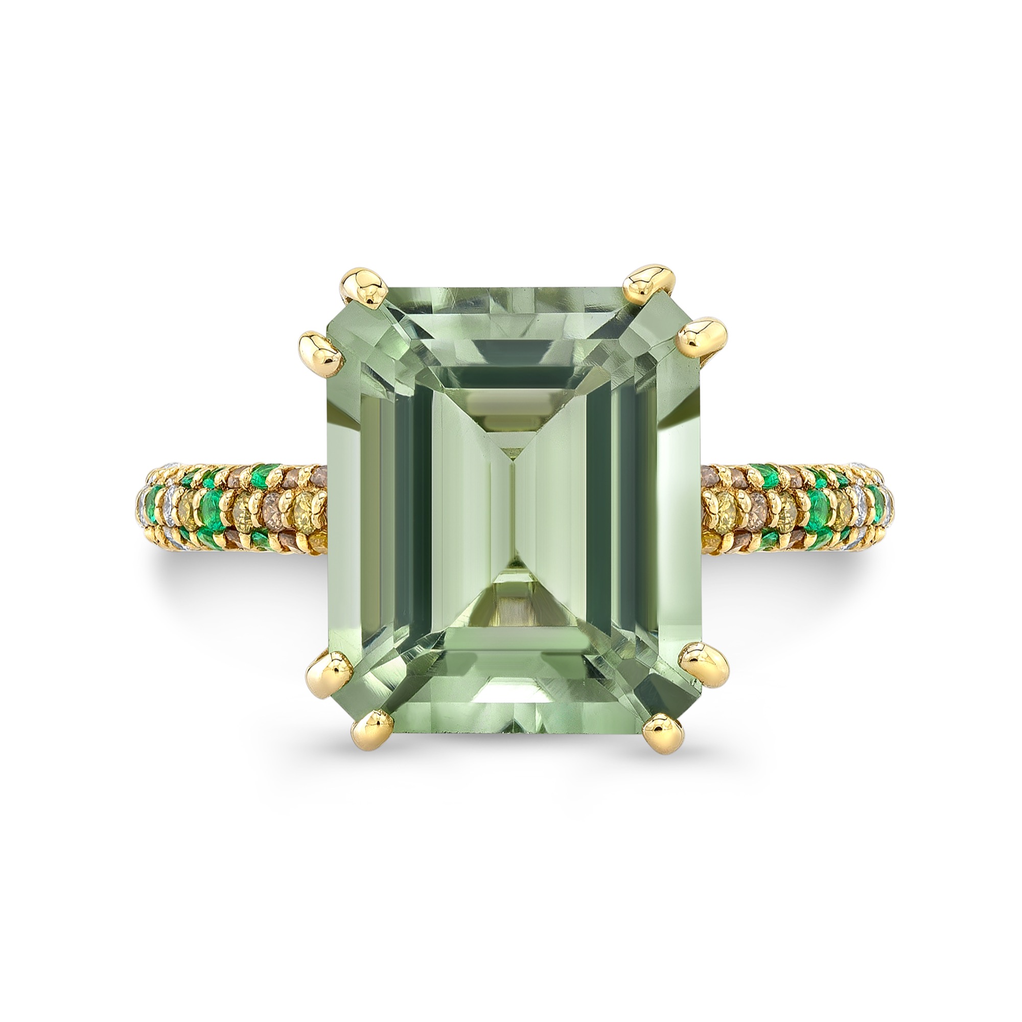 Solitary micro pave with ombre effect and cuashion cut emerald