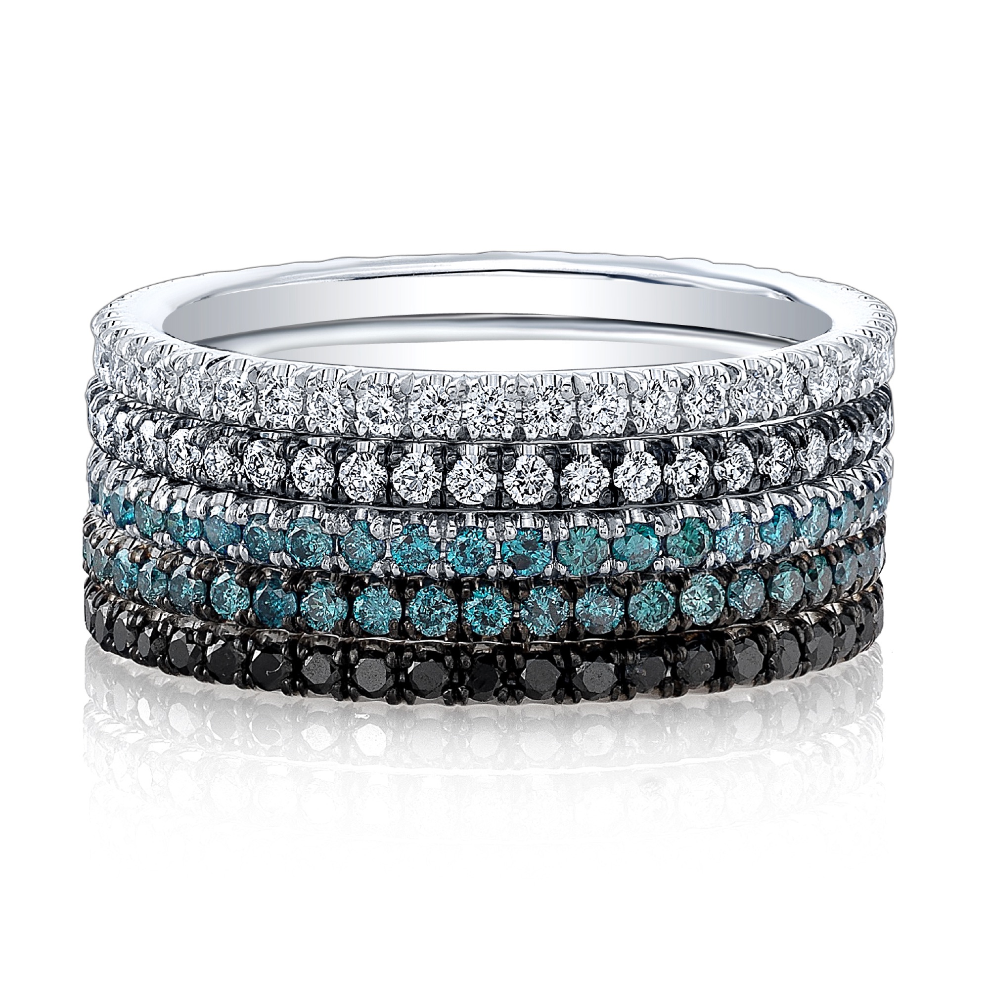 Stackable eternity rings with ombre effect with white, blue and black diamonds