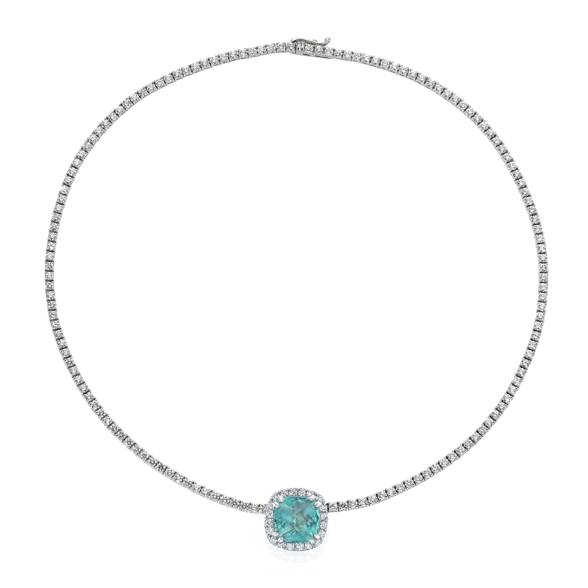 Tennis necklace with a center cushion cut aquamarine set in a diamond halo.
